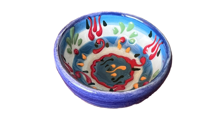 Dieses niedliche handgefertigte Schälchen aus Spanien besticht durch seine intensive Turquisfarbe und bunte Verzierungen. Innen befindet sich ein buntes Muster mit Turquis und hellblauen Streifen mit bunten Verzierungen, draußen ist es blau. Mit einem Durchmesser von circa 6 cm und einer Höhe von 3 cm eignet es sich als Prise-Schälchen beim Kochen oder für Gewürze auf dem Tisch, für Verkostungsportionen wie Olivenöl, kleine Dessertproben, Chutneys, Wasabi, Ketchup oder Senf oder z.B. für die Kern von Oliven oder als eine Ablage für eine Teekugel. Es eignet sich auch zur Aufbewahrung von kleine Gegenstände wie Ohrringe, Ringe, Büroklammern, Kopfhörer oder Münzen.