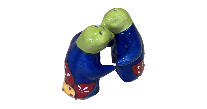 Diese niedlichen Pinguin-Salz- und Pfefferstreuer lassen sich liebevoll zu einer kleinen Umarmung zusammenstellen und bringen sofort gute Laune auf den Tisch. Die beiden Figuren sind in intensivem Blau gehalten, tragen hell-grüne Köpfe und besitzen einen rotfarbenen Bereich auf dem Rücken darüber verziert mit weißen Linien. Ein gelber, rot gepunkteter Schwanz rundet das verspielte Design ab.