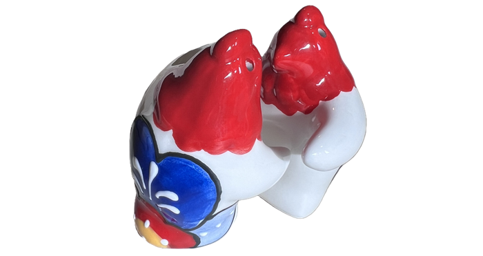 Salz- und Pfefferstreuer Hahn-Umarmung Weiß-Rot aus Spanischer Keramik