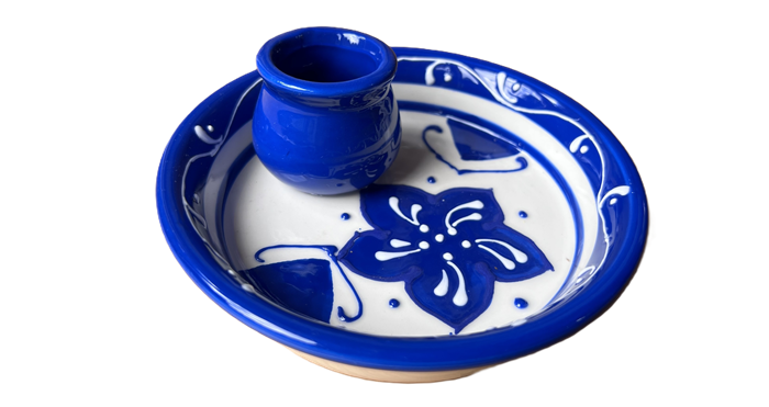 Der kleine befestigte Becher für Kerne ist in der Schale integriert und steckt hervor mit seiner inteniven blauen Farbe. Die Innenseite von der Schale ist weiß und wird von einer blauen Blume mit weißen Verzierungen geschmückt. Blaue, schwungvolle Ornamente umrahmen das florale Motiv, während zwei Dreiecke und blaue Elemente zusätzliche Akzente setzen. Ein schmaler blauer Rand mit weißen Verzierungen rundet das Design harmonisch ab.